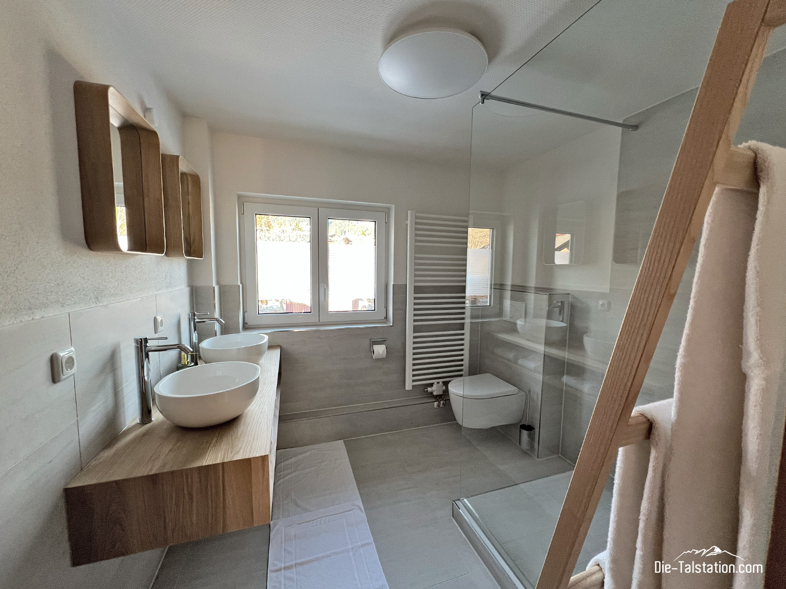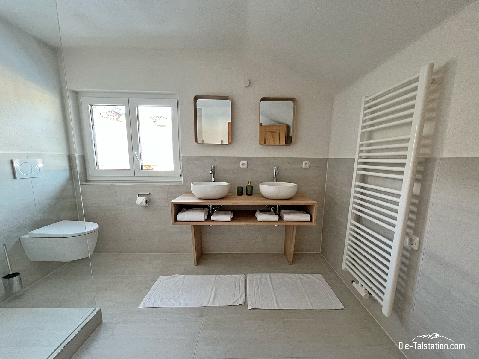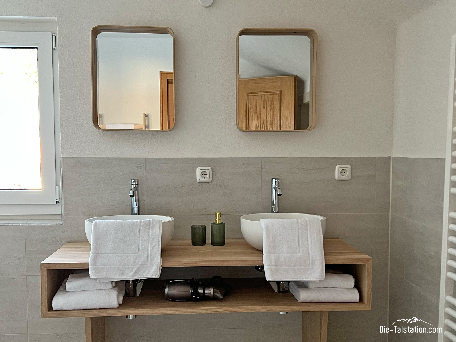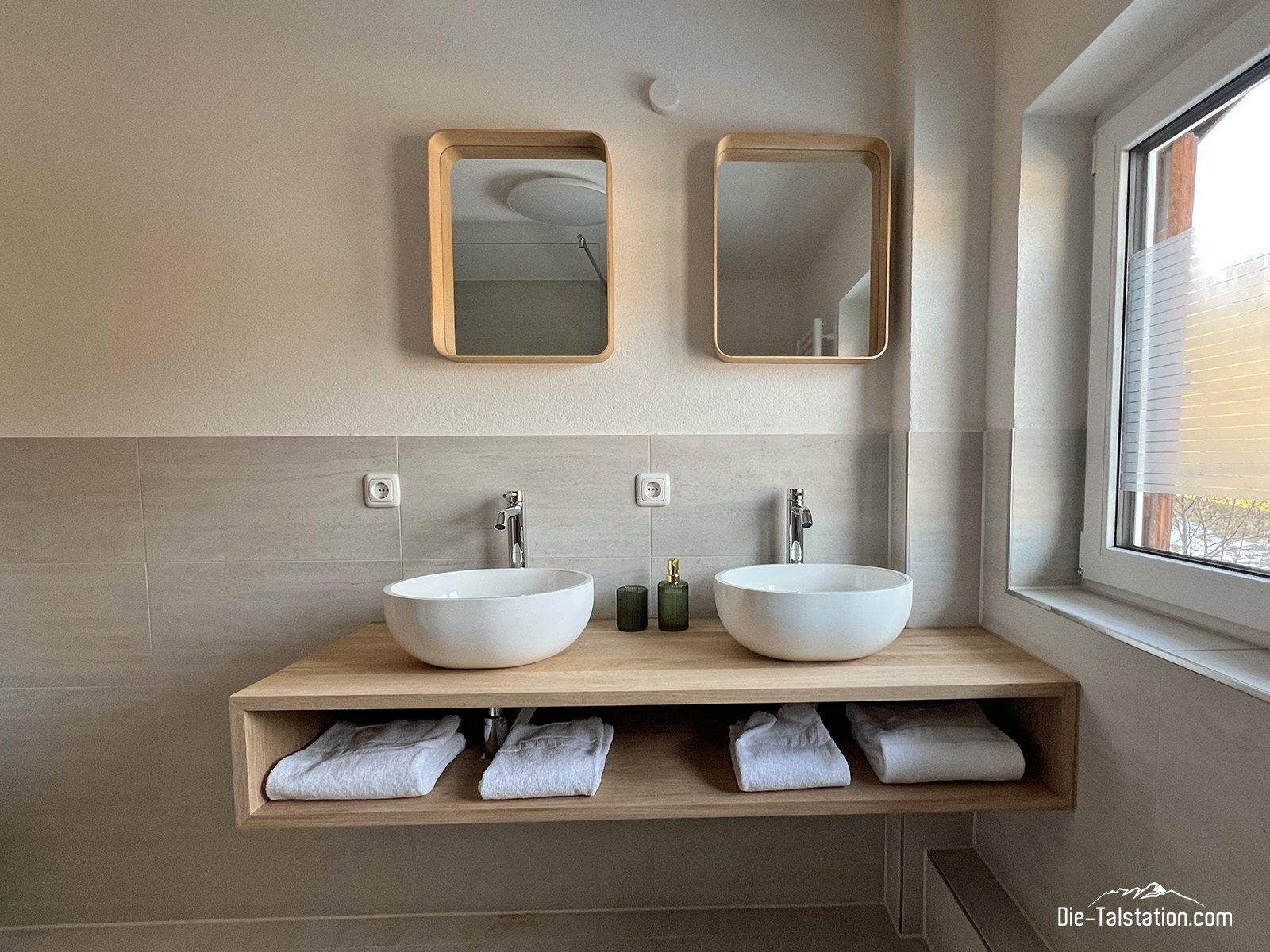 Die großzügigen Doppelwaschbecken aus Keramik bieten Platz und Ruhe zugleich: kein Gedränge, kein Stress – stattdessen Zeit für sich selbst. Das weiche Licht, die schlichten Spiegel und die liebevoll bereitgelegten Handtücher vermitteln ein Gefühl von Ordnung und Geborgenheit. Hier wird das morgendliche Ritual zu einem bewussten Start in den Tag, begleitet von Tageslicht und einem Moment der Stille.